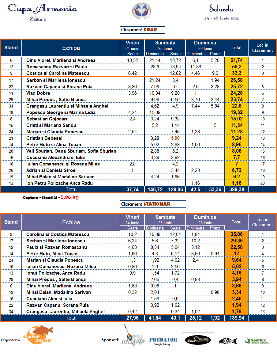 Felicitari tutror participantilor si participantelor un concurs de nota 20+, un concurs dupa care m-am ales cu un partener nou( partenerul meu de viatza de zi cu zi), care de altfel a salvat si onoarea familiei ocupand lcul 2 la sttionar. In 3 ani de competiei nu am vazut o asemenea organizare, atata daruire si suflet pus ca totul sa iasa prfect FELICITARI Adina si Tibi Manascu. Felicitari castigatorilor, in mod special Carolinei Mateescu si lui n-ea Maty care mia zburat locul 3 in ultimele 2 ore de concurs( un mare pescar de la care ai multe de invatat.