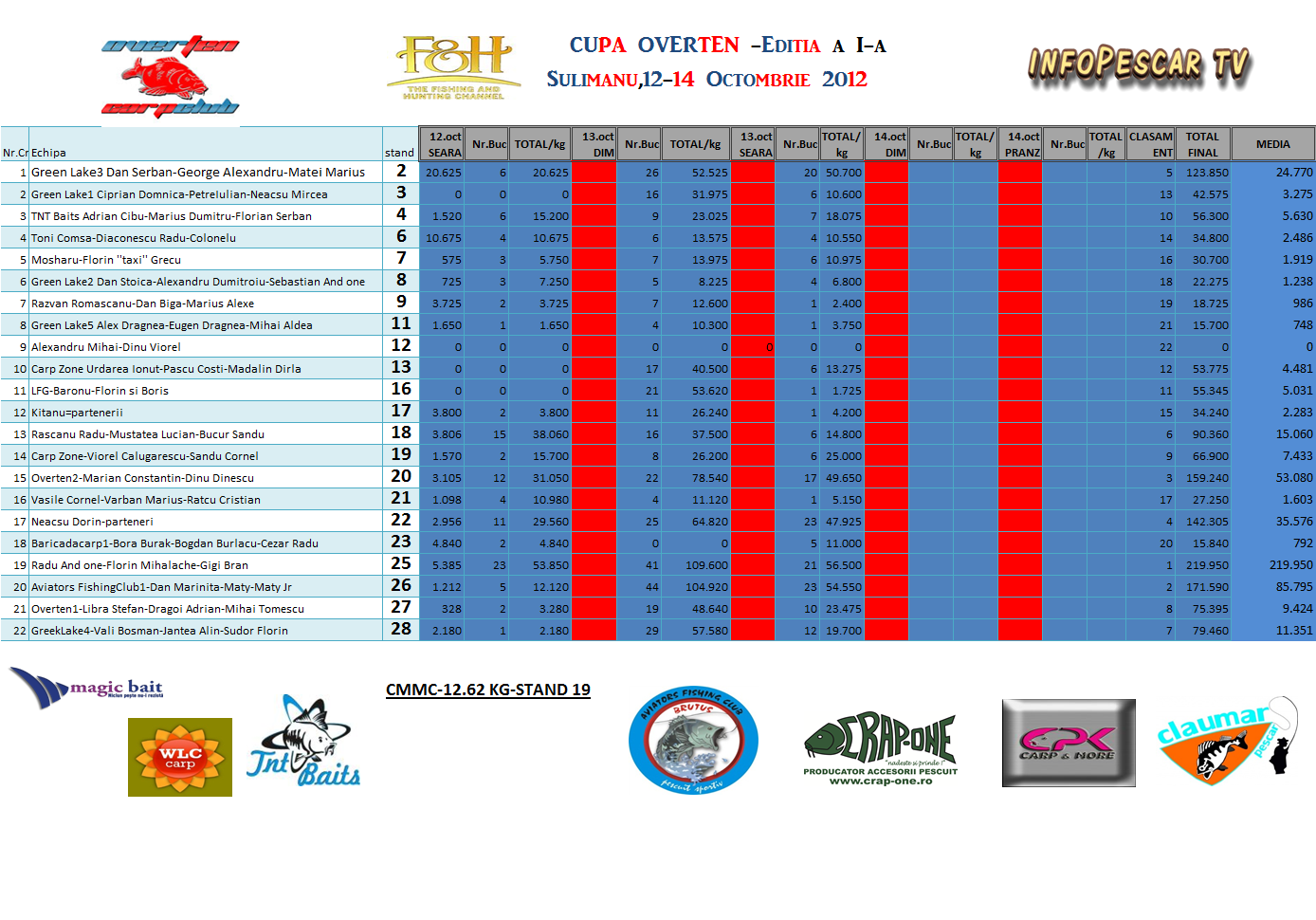 multumim administratiei lacului sulimanul DAN MARINITA,DAN BITMAN,multumim sponsorilor si f&h si nu in ultimul rand tuturor participantilor care au contribuit la desfasurarea acestui concurs in care cantitate totala de peste prins a fost de 2527,045 kg,cu un numar de pesti de 1026 bucati avand o medie de 2,463.