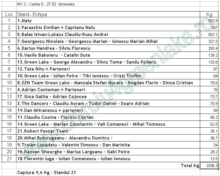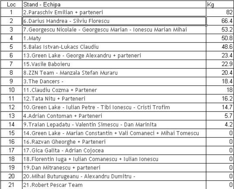 Tibi in postarea lui de ieri a intuit perfect, desfasurarea concursului, locurile prinzatoare si clasamentul final (sunt sigur ca asa va fii, cu foarte mici exceptii. La acest concurs, nu a contat nada, cat avantajul apei mai mici si lansarea langa malul opus - vezi pozitionarea standurilor. Asta este opinia mea ;)
