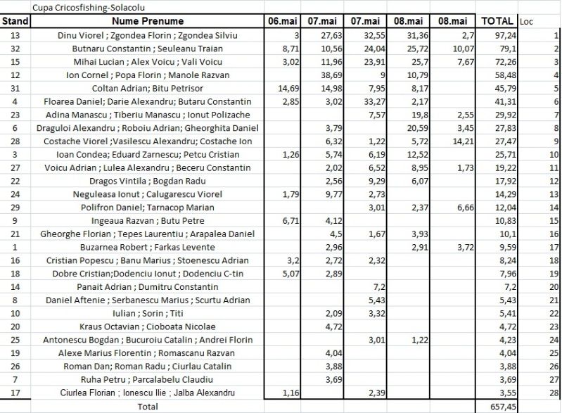 Putin peste s-a prins...standul 32 , standul 14 ..etc, facand o paralela cu Memorialul " Gabi Neamtu ", unde vremea a fost similara cu cea de la cest concurs, cu 19 echipe cu o cantitate totala de 1078 kg....cantitatea de peste este drastic mai mica. De ce oare ?