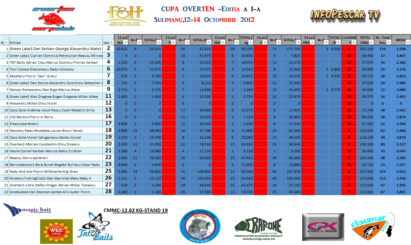 multumim administratiei lacului sulimanul DAN MARINITA,DAN BITMAN,multumim sponsorilor si f&h si nu in ultimul rand tuturor participantilor care au contribuit la desfasurarea acestui concurs in care cantitate totala de peste prins a fost de 2527,045 kg,cu un numar de pesti de 1026 bucati avand o medie de 2,463.