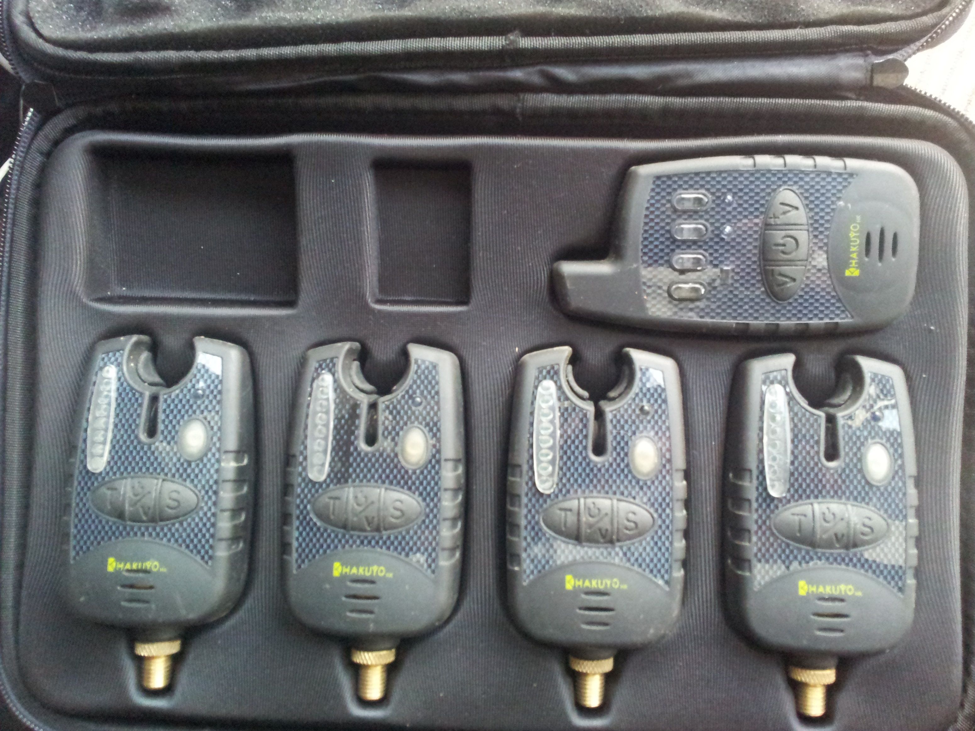 Setul se compune din 4 senzori , statie si valigeta de prezentare , este cumparat toamna trecuta , a participat doar la o partida de pescuit apoi au fost desfacuti , refacute toate lipiturile circuitelor cu simt de raspundere , cablajul si contactele au fost lacuite cu lac special a.i. umiditaea nu va mai fi o problema. Apoi cauciucurile de pe partea de sprijin a lansetelor au fost lipite a.i. firul nu mai poate intra sub ele.