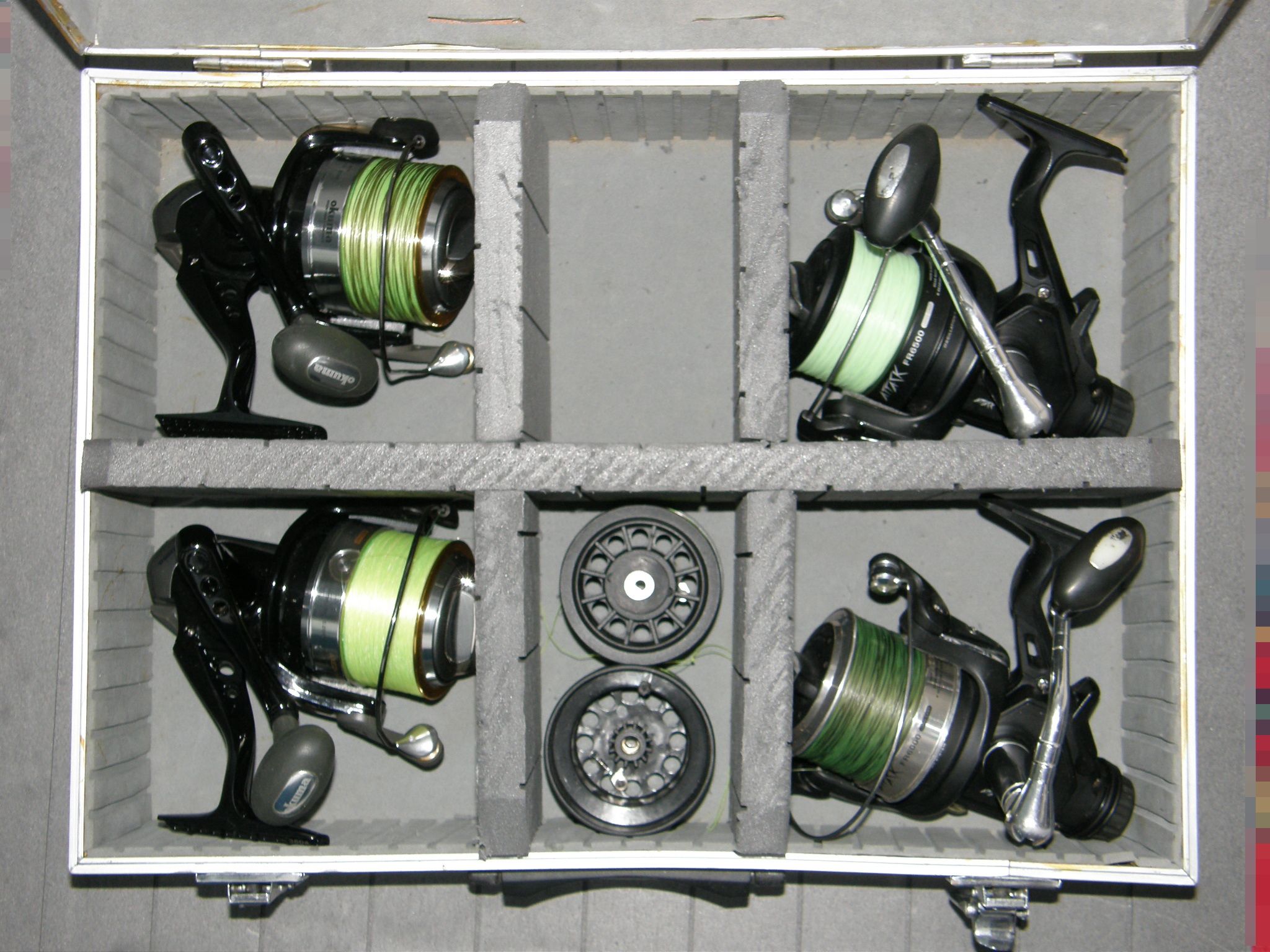 Geanta se vinde goala - mulinetele au fost puse in cutie ca exemplu. Sunt 4 mulinete medii spre mari (2 Okuma Axeon VII AXII- 60 si 2 Attack FR 6500 - incap lejer si 8 tamburi de rezerva sau alte mulinete mai mici).