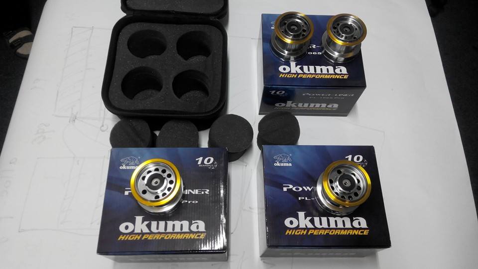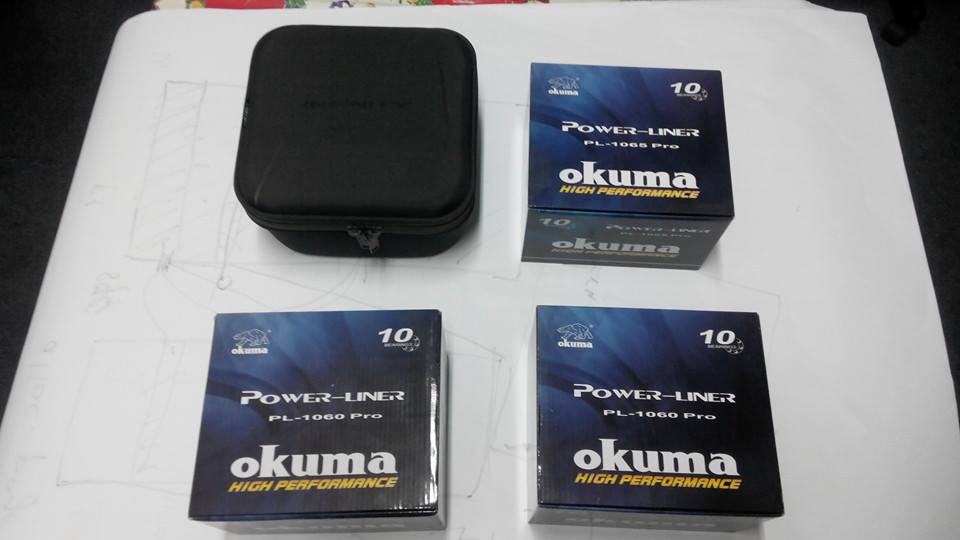 4 mulinete Okuma Powerliner Baitfeeder 1065 Pro cu tamburi de rezerva din aluminiu marimea 1060(de fapt am cumparat 2 buc 1065 si doua 1060 pentru a putea sa pescuiesc si cu fire subtiri dar nu am mai apucat sa-i incarc deoarece nu i-am folosit niciodata).