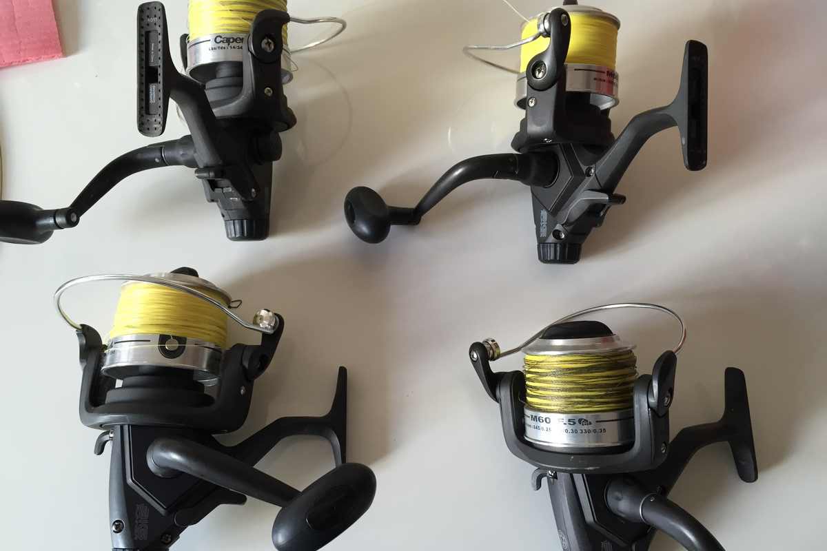 Vand 4 bucati mulinete Caperlan BIG Runner,5 rulmenti,biterunner, cu tambur metalic,echipate cu fir 0,30 mm.