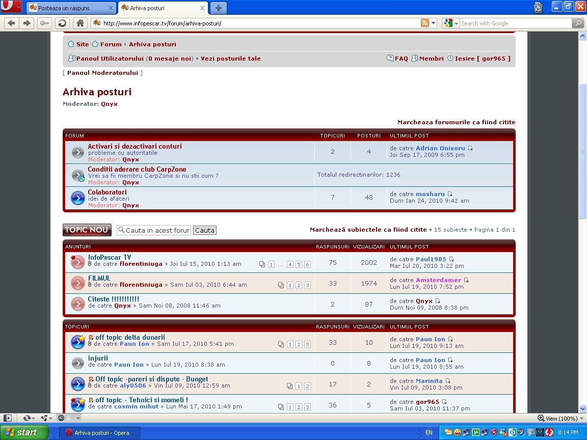Pana in momentul cand au fost alesi ca moderi, userul sebastian si userul sorin, toate erau la locul lor, iar cei care postam pe acest subiect, ne aduceam aportul ,fiecare in limita cunostintelor cu tot ce stiam, sau eram dornici sa stim. mai cate o postare off-topic, mai cate o litera uitata, mai cate o pictograma gresita, dar mergeam inainte. nu sau folosit sub nici o forma expresii triviale, discutii contradictorii intre useri, sau jigniri. In momentul cand au fost numiti ,,moderatori'' respectivii, am facut felicitarile de rigoare si le-am urat ,,moderare'' usoara. Dupa o acalmie de vreo 2 saptamani , am inceput sa fim facuti agramati, bosorogi, dovlecari cu puroi si carii in cap, balbaiti si credeti-ma ca mie sila sa continui cu aceste afirmatii pline de venin si desconsiderare. actuali moderi au venit cu publicarea ,, curicullum vitae''- facultati de lingvistica si filozofie, inginerat silvicol, precum si cu binecunoscuta si distrugatoarea: l'etat c'est mois (toti userii inteleg, nu suntem chiar asa de...) au inceput conditii de postare daca ai fost in Delta Dunarii (poate am fost, dar nu am pescuit, a uitat sa precizeze). Consider ca cei care avem placerea si dorinta de comunicare pe acest site Infopescartv, nu suntem logati in dorinta de a ne continua sau aprofunda vastele cunostinte care sunt alaturi de domeniul pescuitului sportiv- pentru acestea avem net-ul la dispozitie. Pescarii sunt mai comunicativi, mai spontani mai gresim la tastarea unor postari. Eu cel putin am inchegat foarte multe prietenii aici, comunicam aproape zilnic la tel. sau mess, ne-am cunoscut personal si tinem legatura. nici unul dintre noi nu suntem dezamagiti de comportametul celuilalt. Cu asemenea moderi care creaza numai discordie ne este greu sa mai continuam, participarea la un anumit subiect.