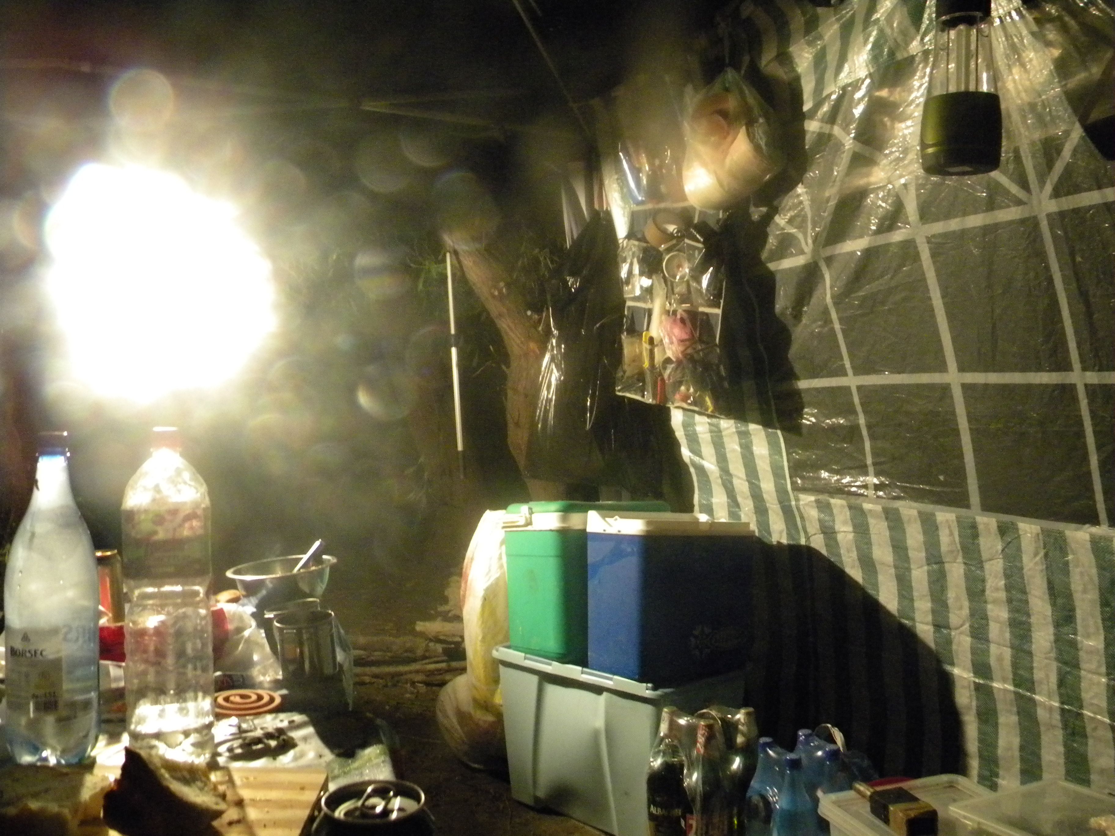 Am ales sa-mi amplasez patul sub pavilion, pentru a avea sub observatie tabara si pentru a putea interveni cat mai rapid in caz de cine stie ce urgente si...ce comoditate, mare inventie paturile astea. Sebi la cort... drujba si taie la busteni