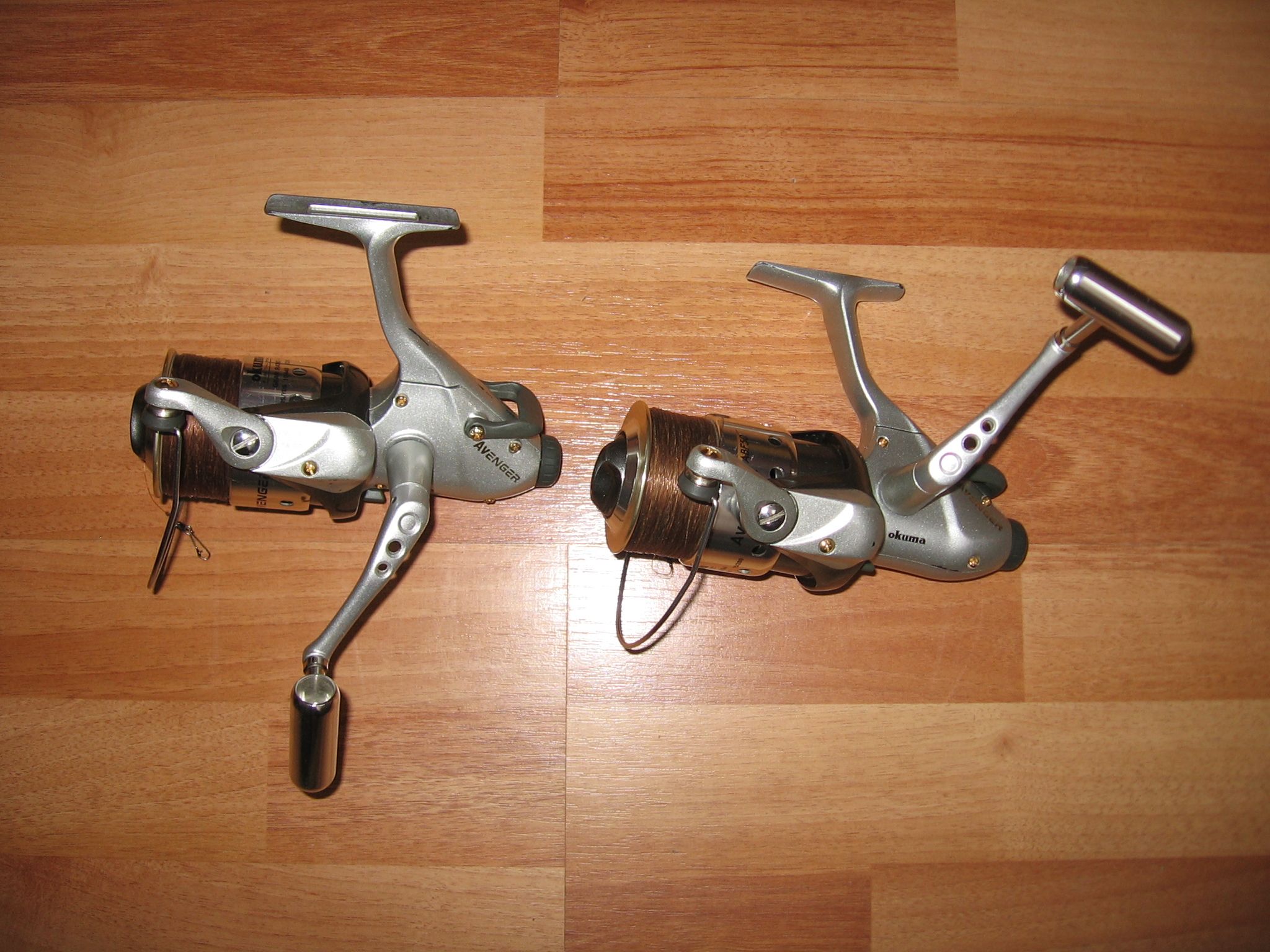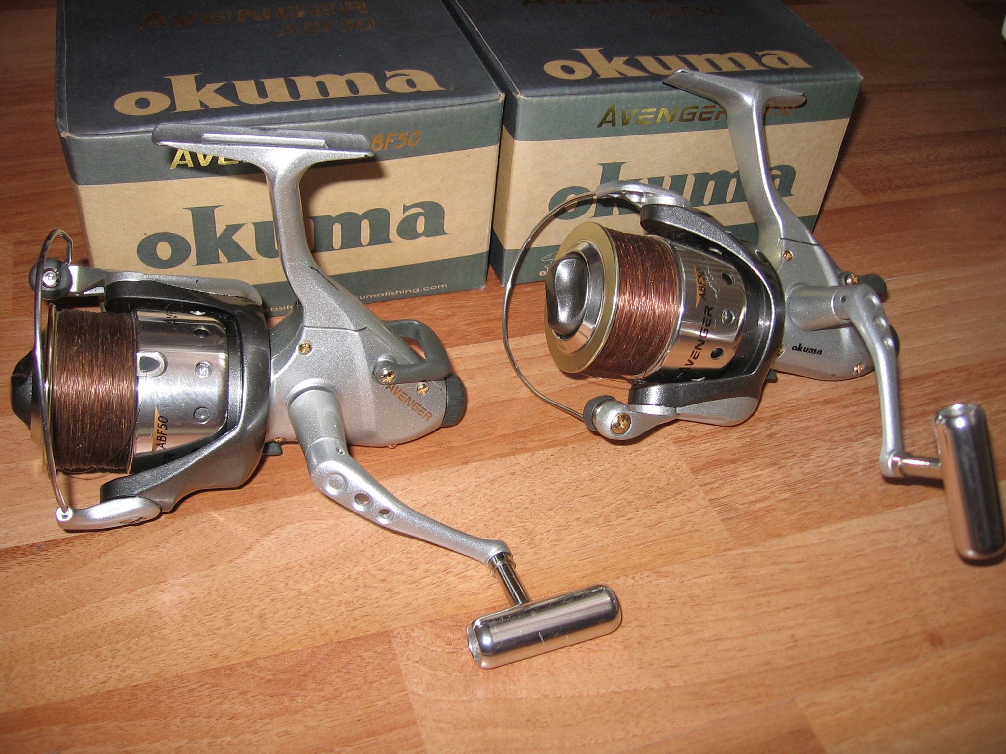 Vand 2 mulinete Okuma Avenger Baitfeeder ABF 50, le am de 2 sezoane, sunt bine intretinute, echipate cu fir