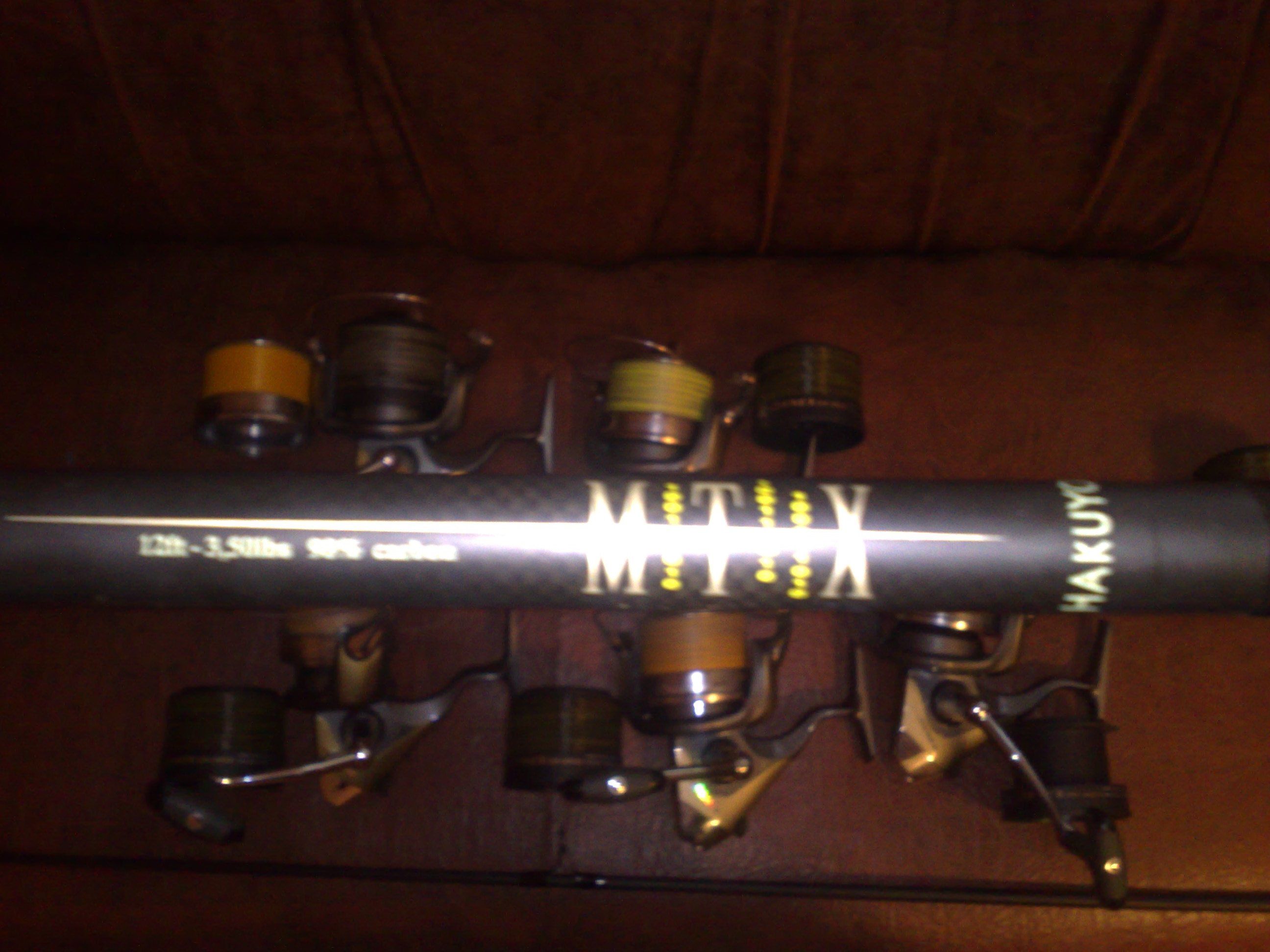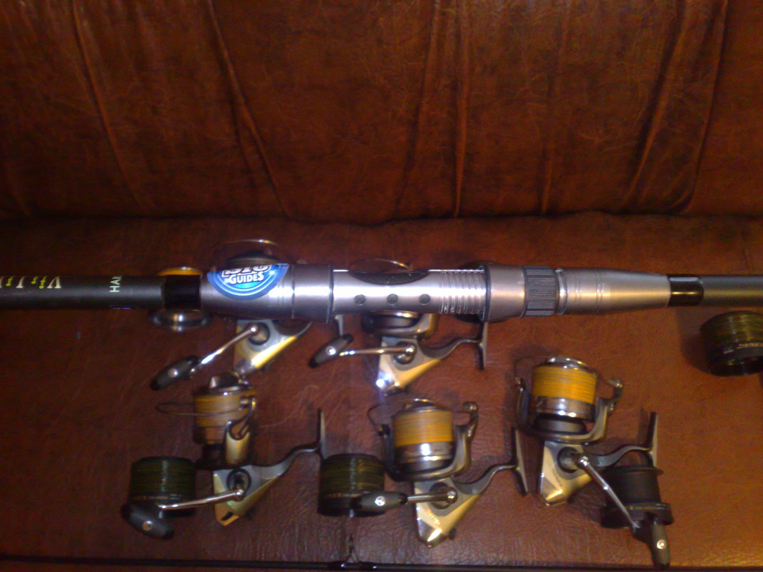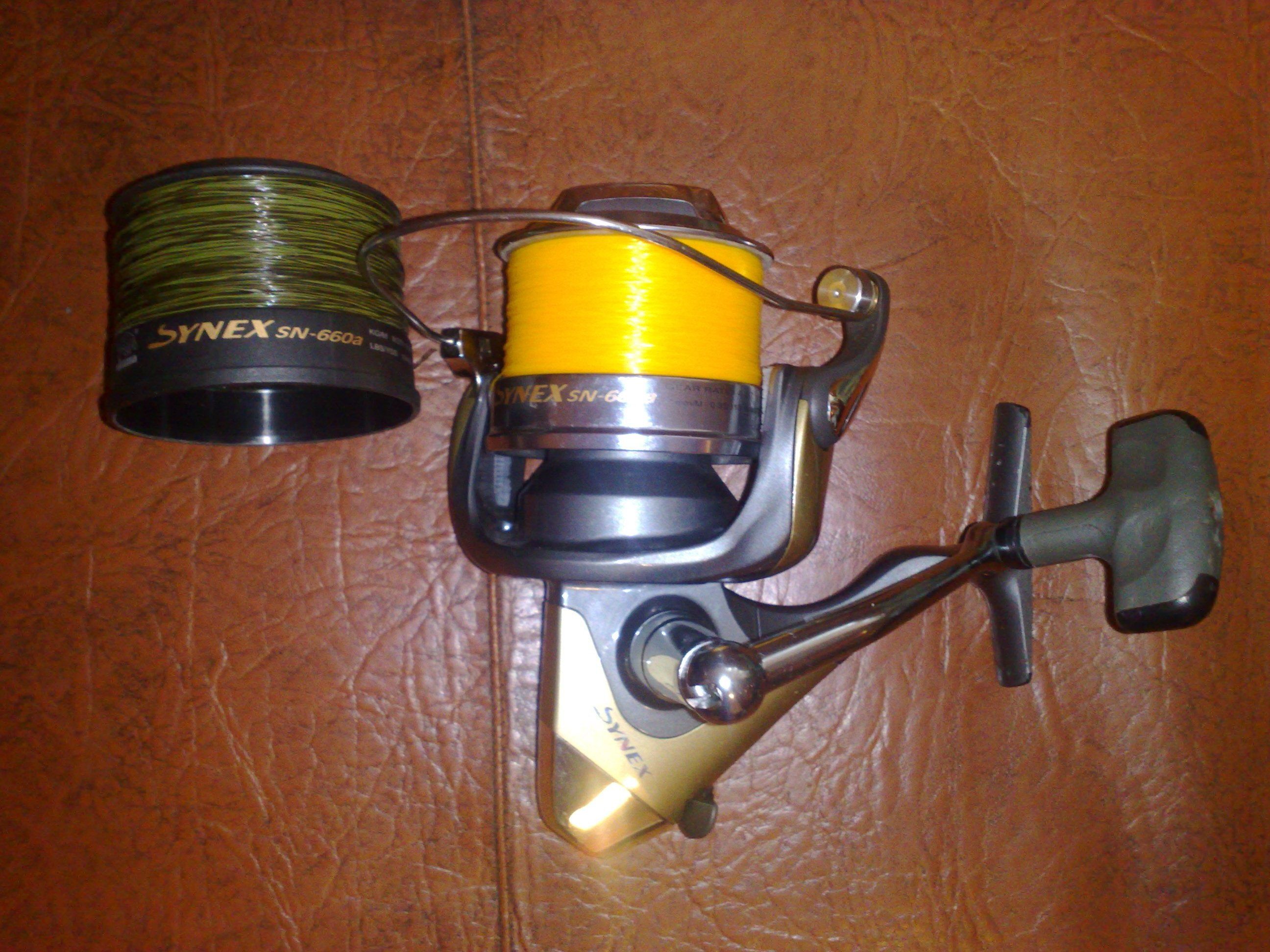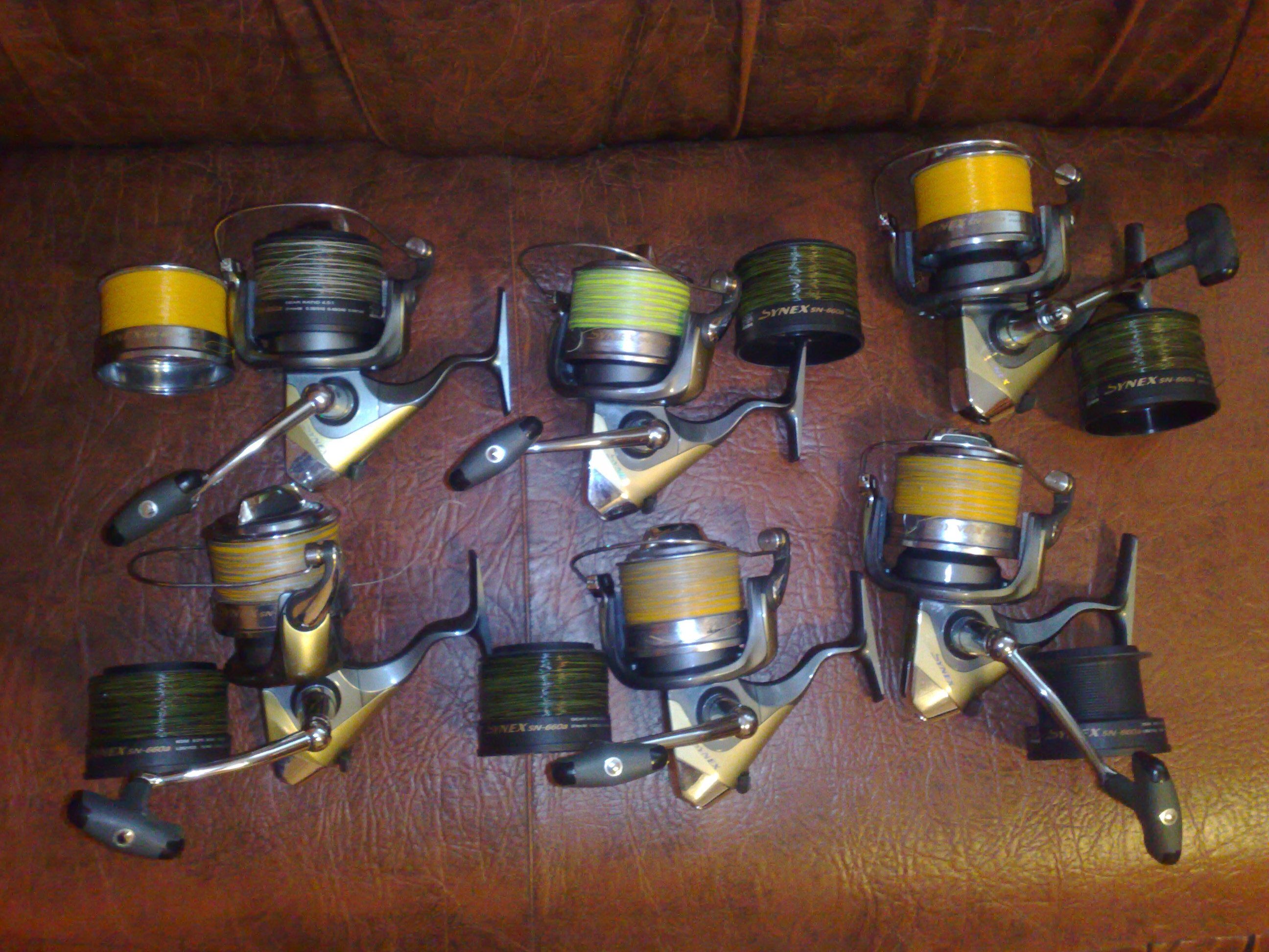 Si 6 mulinete Okuma Synex sn660a folosite la fel ca si lansetele decat sezonul acesta. Bine intretinute, 5 echipate cu fir Ultima Distance 0,30 pe principali + 5 tamburi de rezerva cu fir Sufix Duo-Core 0,40, iar una cu fir Carp Expert Fluo 0,30 pe principal + tamburul de rezerva gol. Pret: 800 ron-pachet sau 140 ron bucata. Pret pachet complet lansete+ mulinete: 1500ron.