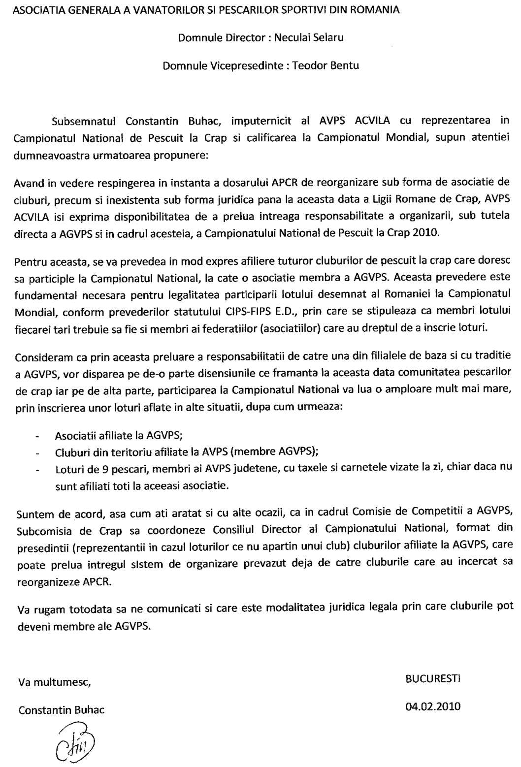 Totusi sa va arat ca intradevar imi place si doresc COMPETITIE lotul legitimat de Buhac pana la data de 07 februarie 2010 sa se intreaca de trei ori pe balta MOARA [platim frateste ] cu cei 9 care doriti voi sa fie legitimati in vederea reprezentari Asociatiei Acvila.