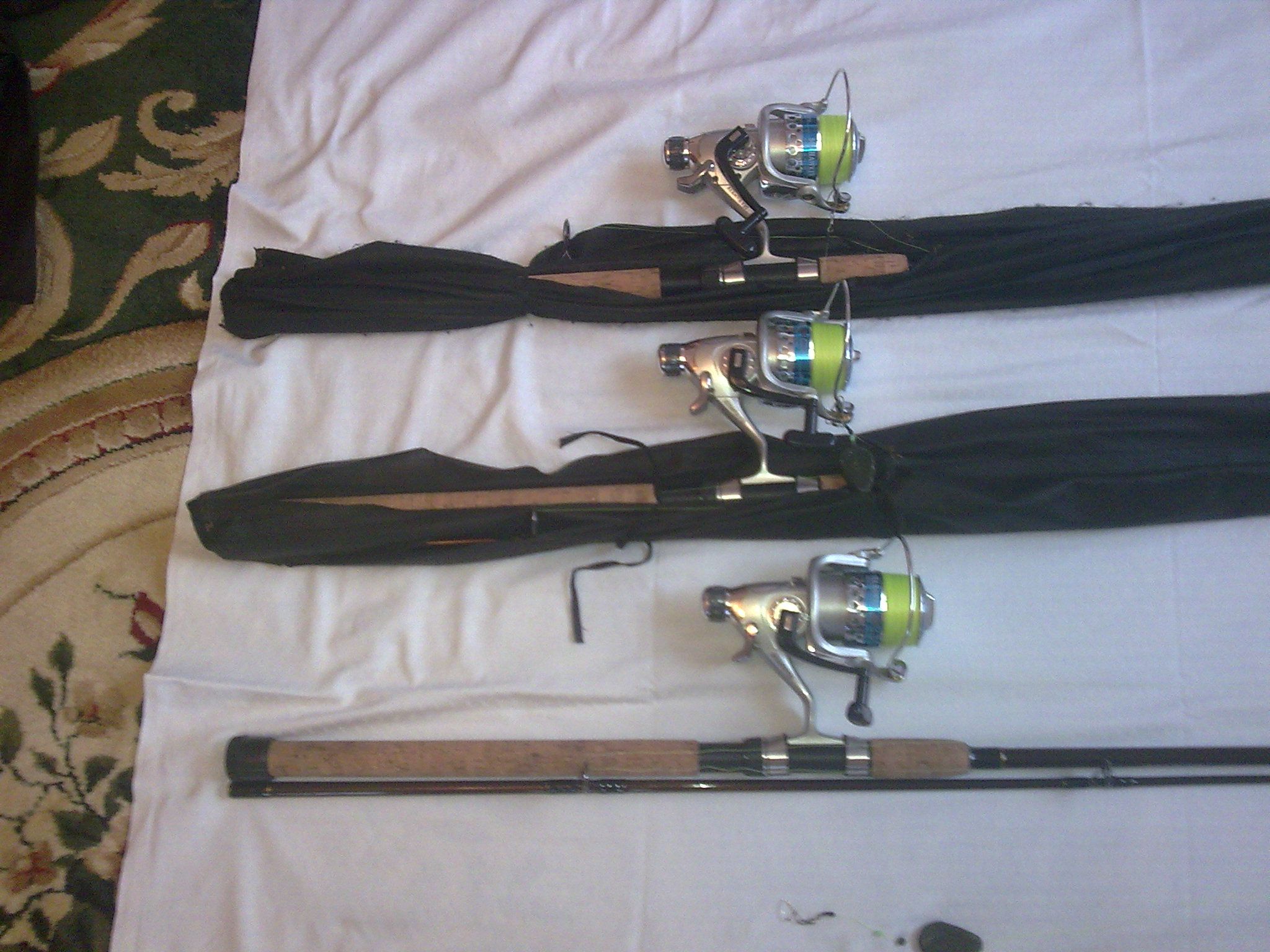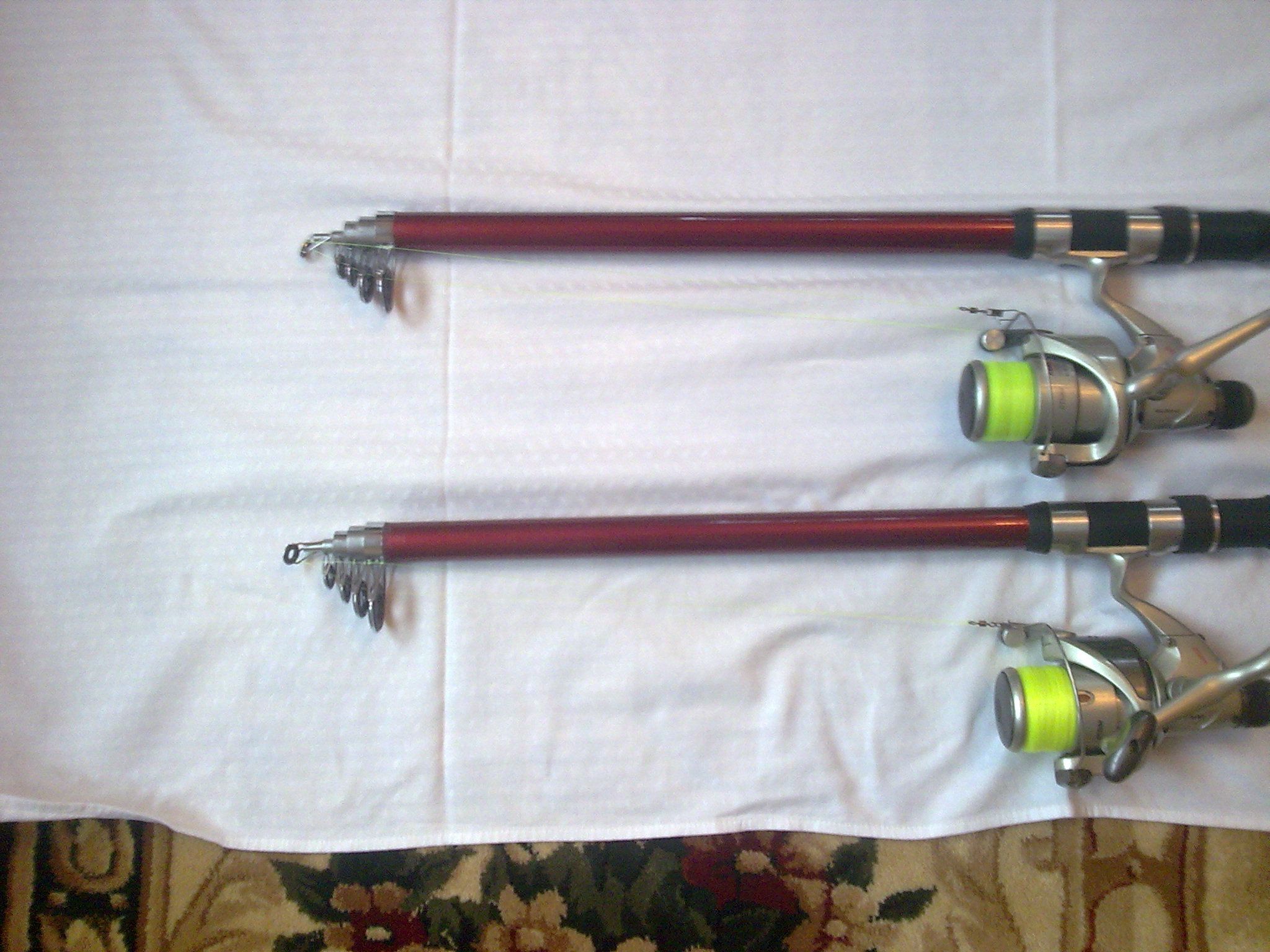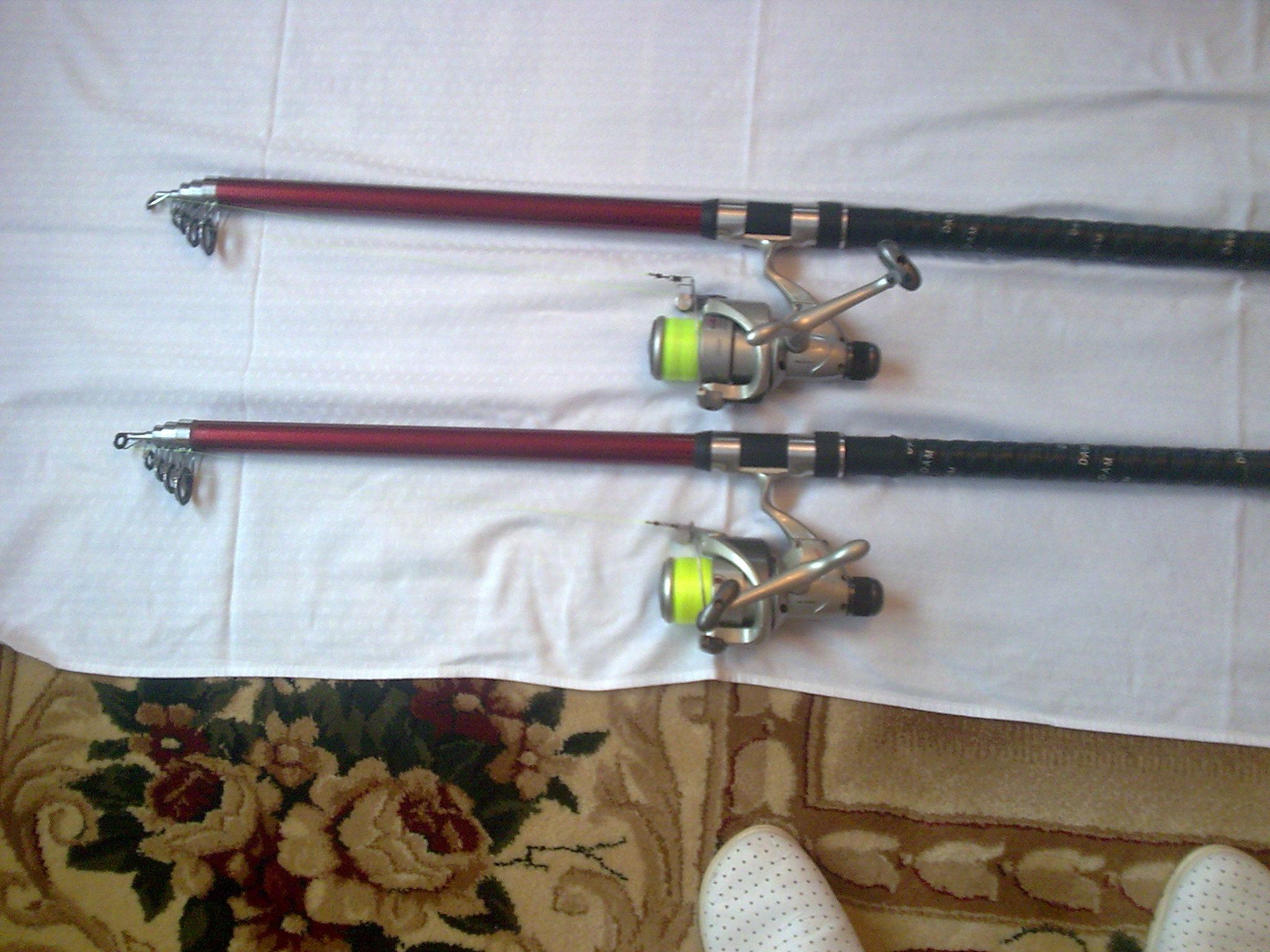 8. Daiwa California green telescopice 3,60 m. 100-300 gr. , echipate cu mulinete Rainbow GT 5000, la 90 lei/set. - 2 seturi