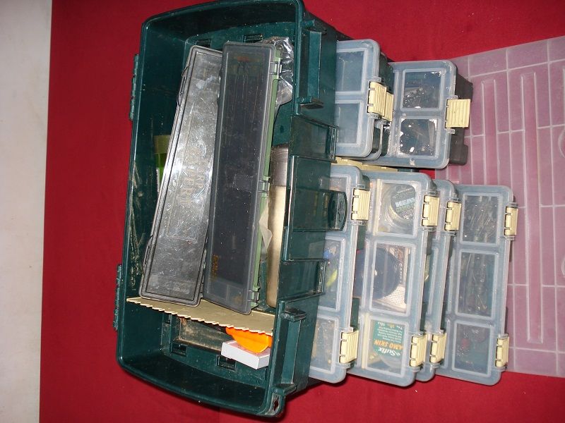 18 trusa verde cu sertare cu tot ce este in ea fire camasuite pva carlige plumbi momitoare ,agrafe ,ansamblu marker etc 300