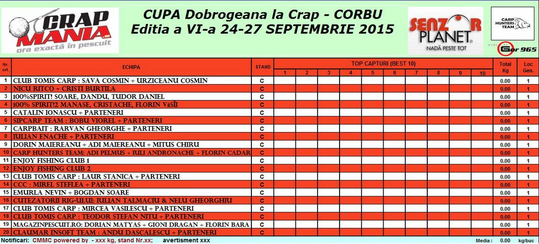 Concursul incepe JOI la ora 12.00 si se termina DUMINICA la ora 12,00. Daca o echipa inteapa un crap in ultimele minute are la dispozitie 15 minute dupa ora 12,00 sa-l scoata.